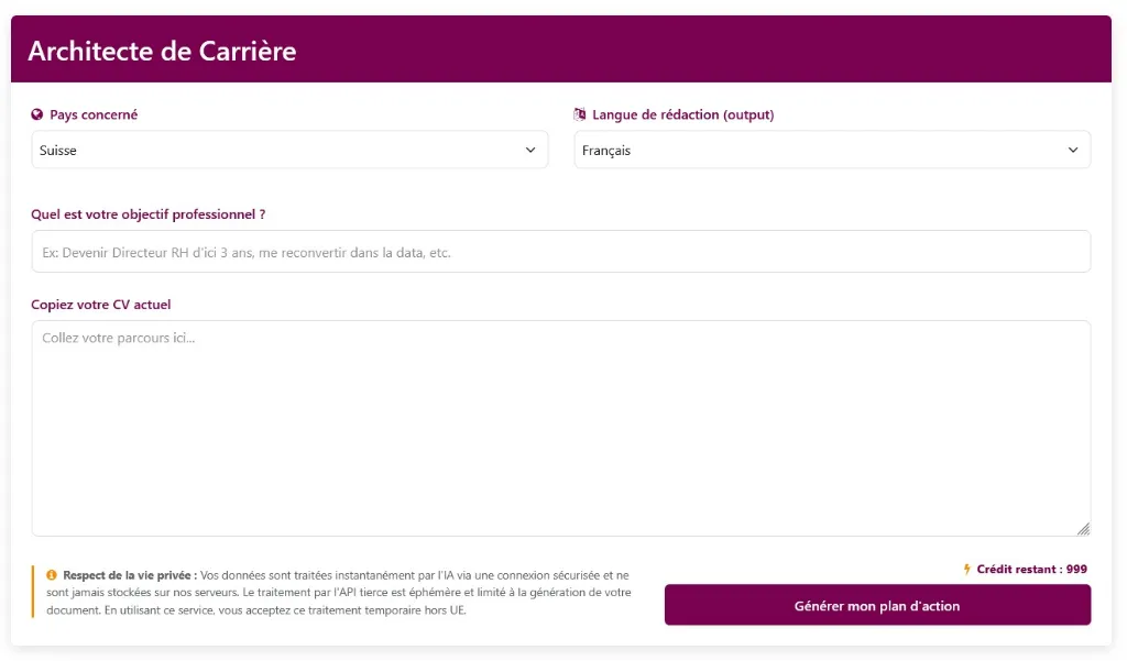 Ces outils sont voués à vous guider et vous donner une base de réflexion pour créer, adapter ou améliorer vos documents et projets. Il est fortement recommandé de les utiliser pour vous donner des pistes d'amélioration plus que d'utiliser le résultat obtenu "tel quel" - Nous vous accompagnons volontiers pour aller plus loin!